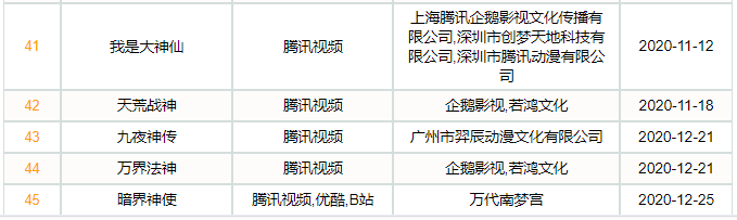 2020年,腾讯视频、B站、爱奇艺、优酷、芒果TV共新上玄幻奇幻题材国漫45部。