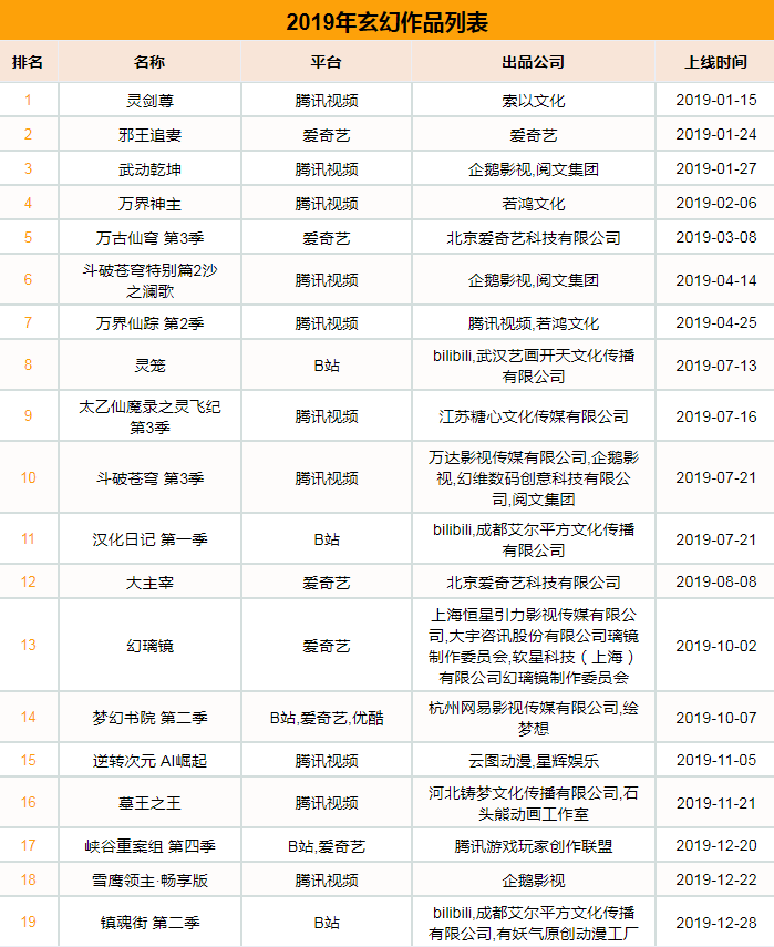 2019年,腾讯视频、B站、爱奇艺、优酷、芒果TV共新上玄幻奇幻题材国漫19部。