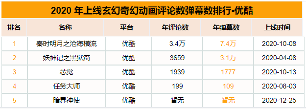 2020年优酷共新上玄幻奇幻题材国漫5部,其中《秦时明月之沧海横流》年最高热度接近8600,《妖神记之黑狱篇》年平均热度为3900,分别是4部作品中的第一名。