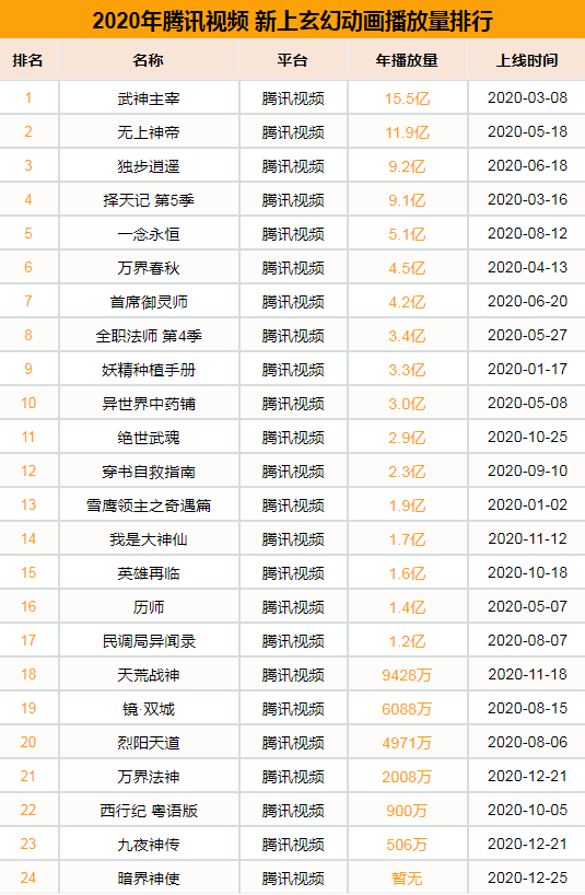 2020年腾讯视频共新上玄幻奇幻题材国漫24部,是所有平台中新上玄幻奇幻题材国漫最多的,继续保持了在这一题材的优势。其中《武神主宰》年播放量为15.5亿,《无上神帝》年播放量为11.9亿,均突破10亿大关。