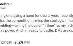 【EV扑克(www.evp66.com)报道】自本月初在推特上发布了“回归宣言”后,周三晚间,因“J4o手牌争议”远离扑克圈近15个月的Garrett Adelstein(盖哥),终于重回扑克赛场,但并不是Hustler Casino Live的节目。