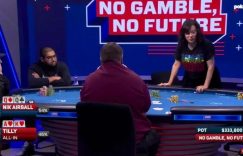 【EV扑克(www.evp68.com)报道】今天要分享的这手牌,发生在最新一集的《No Gamble No Future》节目中,Nik Airball在翻前与Jennifer Tilly“大打出手”,底池高达$333,800。