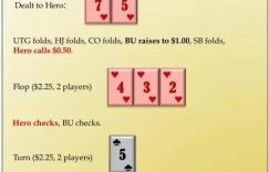 转牌:5♠。双方再次过牌。河牌:K♦。Hero应该怎么行动?翻牌圈应该check-raise,不管对手下注多大。虽然为了保持check范围无上限和具有多种能力,有些同花将放入我的跟注范围,但这手牌很容易受到可能发出的任何红桃的伤害,因此我范围的这个部分的价值最好通过快玩获得。我也会用一些同花听牌和一些非同花顺子听牌诈唬加注。后者将在四红桃转牌面为我提供一个诈唬范围。